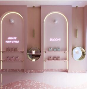 We chose pastel pink as the main color, mixed with creamy white and a light rose gold. The entire space exudes femininity, dreaminess but not too childish – suitable for customers who are young women, love beauty, like cuteness but have mature aesthetic taste.