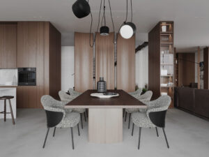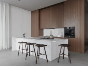 - Main materials such as natural wood, light-veined stone, and linen bring closeness, simplicity but not monotony.