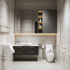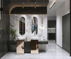 The reception area is the “first handshake” with the guests. In the recent design, I placed the logo glowing with warm white LED on a dark stone background, combined with mirror details and a “floating” cabinet system to create a light, luxurious feeling.