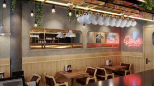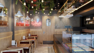 Minimalist space for modern life As an interior designer, I believe that every project needs to reflect the life it serves. The “Done” project was born from the very practical needs of young people: fast food – take away – no mess – still stylish. This is a takeaway restaurant, where the design is not only beautiful but also to optimize every operation, every movement – ​​from customers to staff. ✦ Design style: Neat – Clear – Impressive Done’s space follows the philosophy of “Form follows function“: every detail must serve the purpose of convenience – speed – cleanliness – ease of operation.