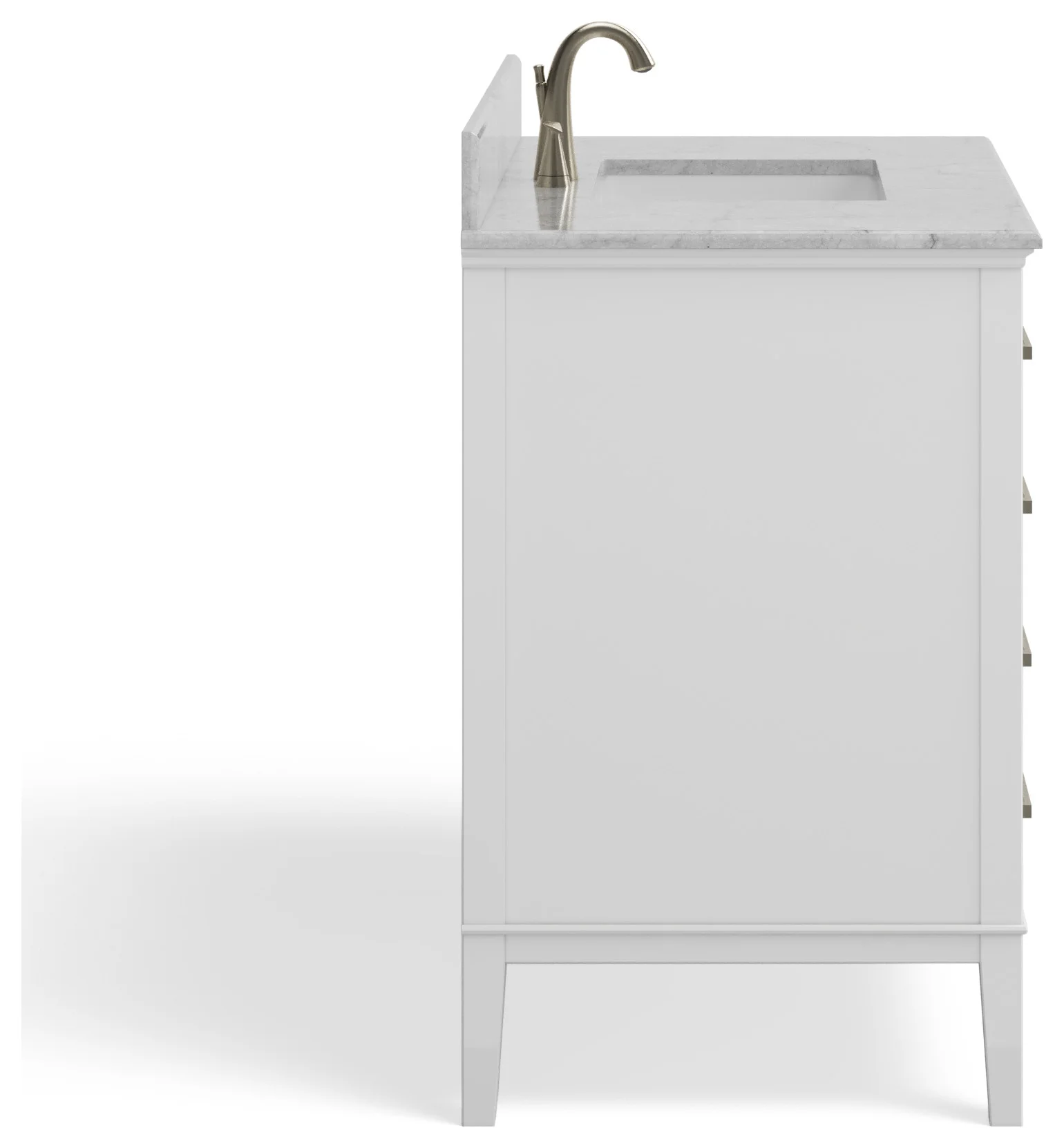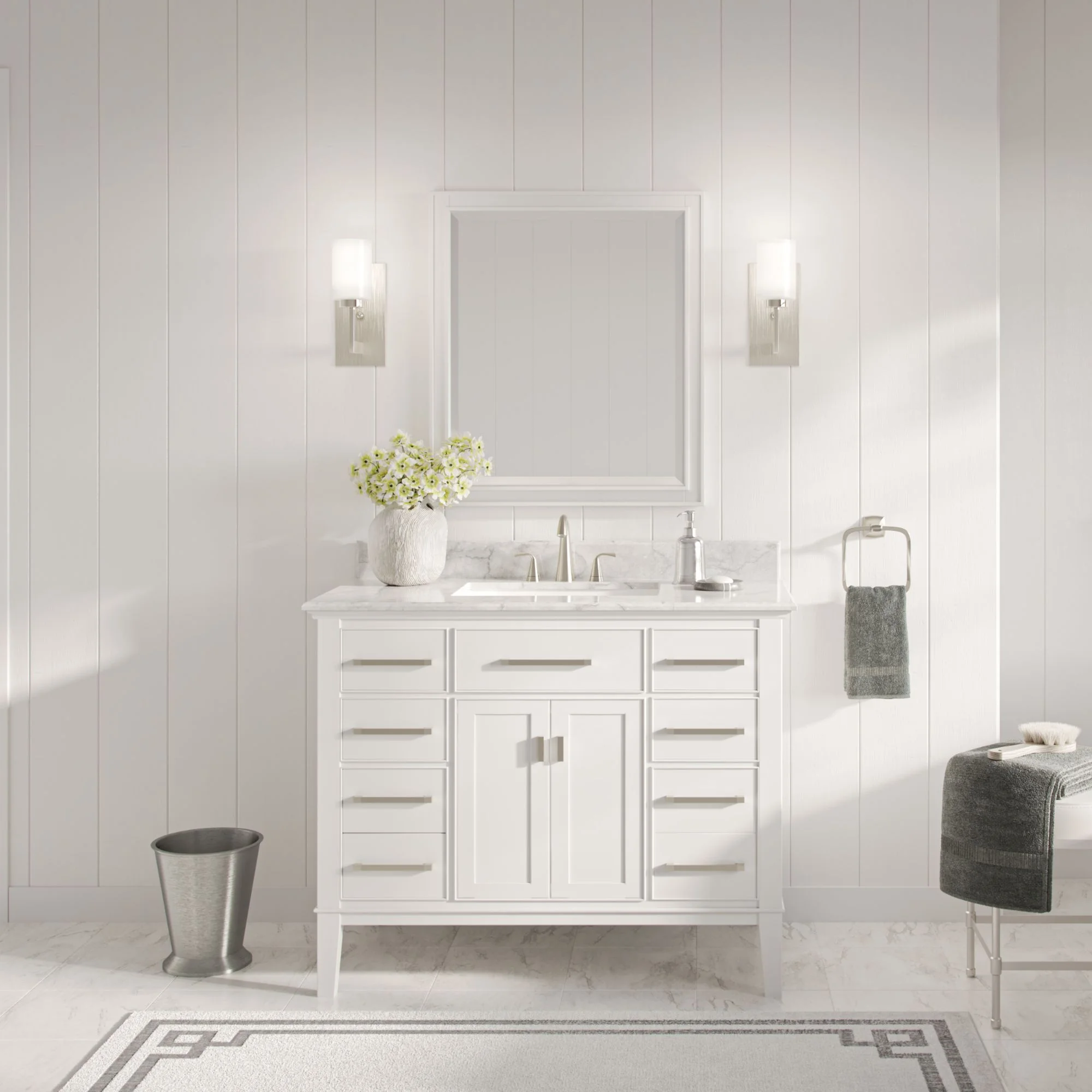 With thoughtful design details, the transitional Danny vanity is elegantly simple yet far from vanilla. The angular, brushed nickel hardware gives this stunner a modern edge, while the slightly flared legs add a playful twist to an otherwise traditional base. As for the gorgeous Carrara marble countertop, add on tons of storage and you’ve got yourself a showstopper that will turn any bathroom— from contemporary to coastal chic—into a functional, luxurious, get-ready retreat.