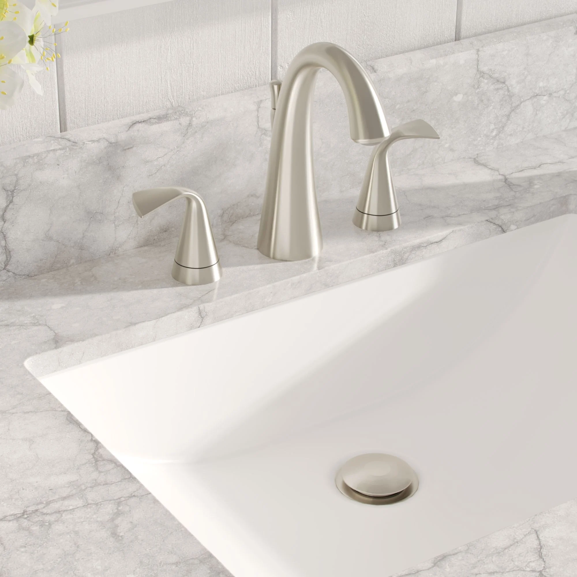 - Top pre-drilled for 8″ widespread faucet