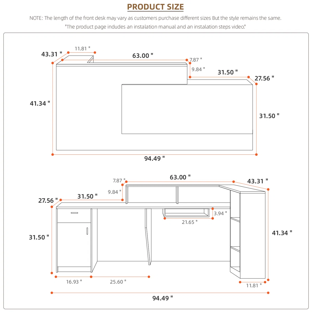 This reception desk has two sizes: 70.87 inches and 82.68 inches, you can choose the right size according to the scene. The simple combination of brown and black is suitable for various styles of storefronts and reception spaces, and is very suitable for handling business, receiving visitors or customers. The spacious, high-designed table top provides ample writing space for visitors, who can make inquiries or make appointments more comfortably. There is ample writing space for reception staff and plenty of room for personal belongings.