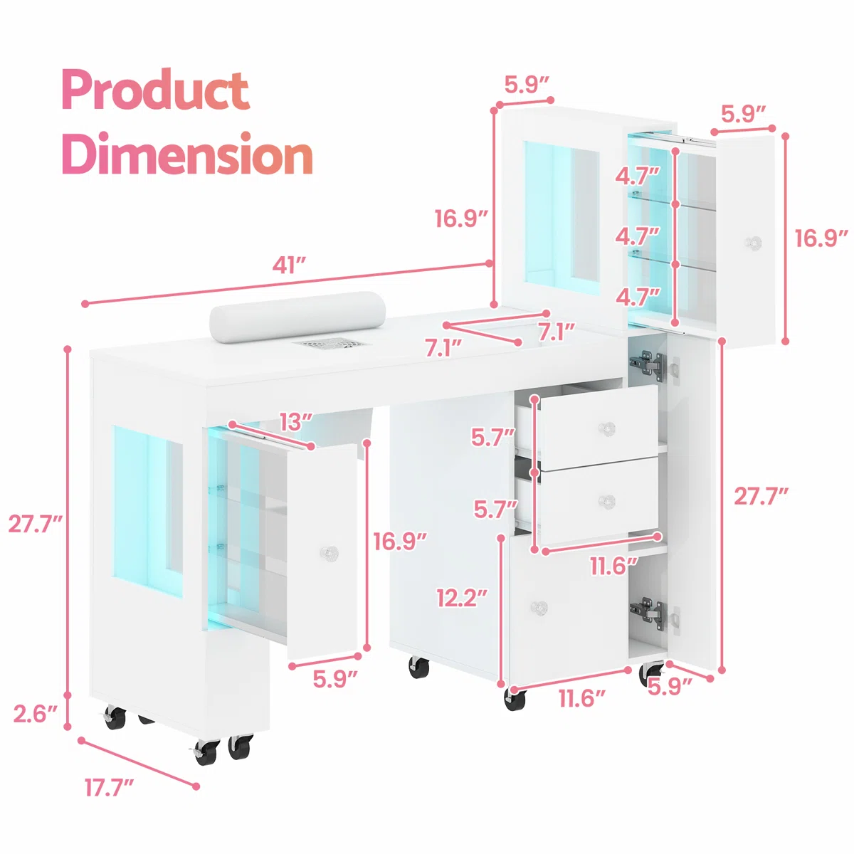 - LED Display Cabinets with Sound-Responsive Lighting: The nail desk features two stylish display cabinets with built-in LED strip lights that change color in response to external environmental sounds, offering a dynamic and customizable lighting effect that reacts to your surroundings.