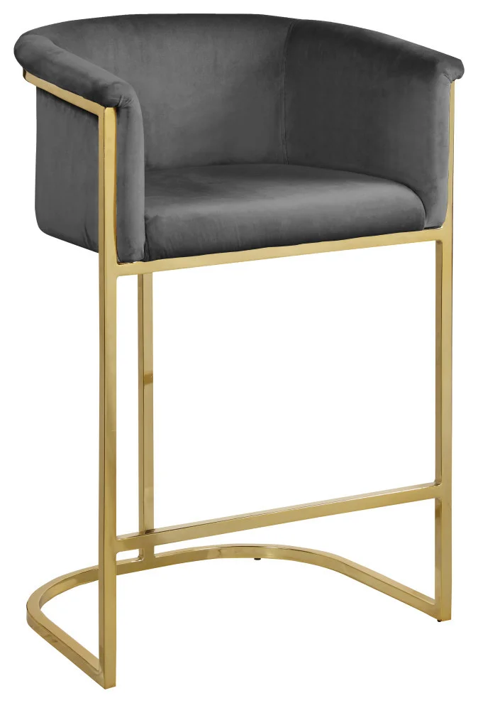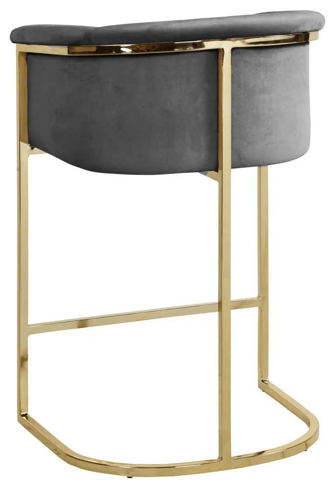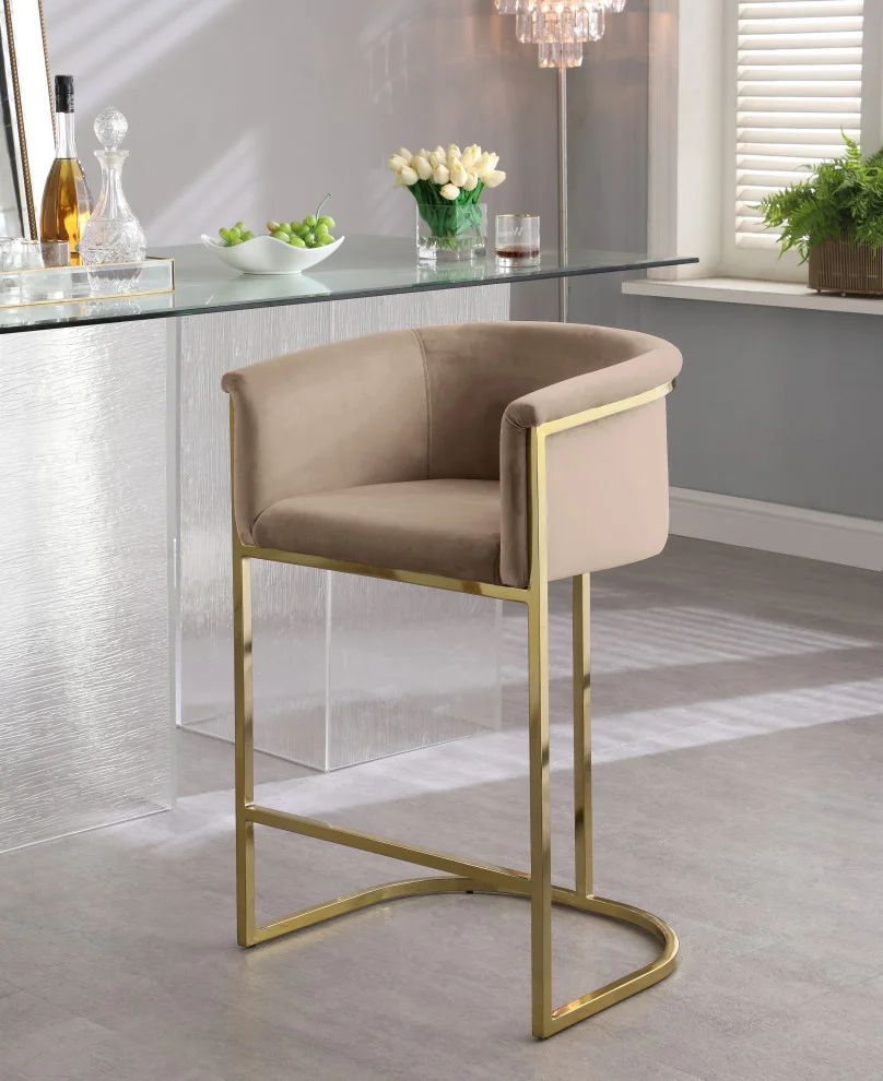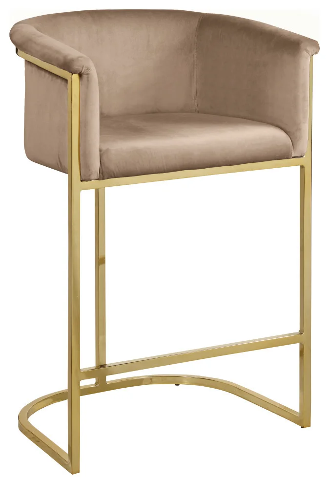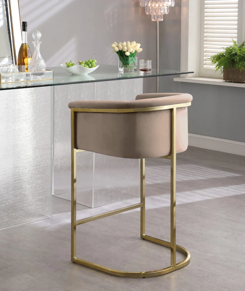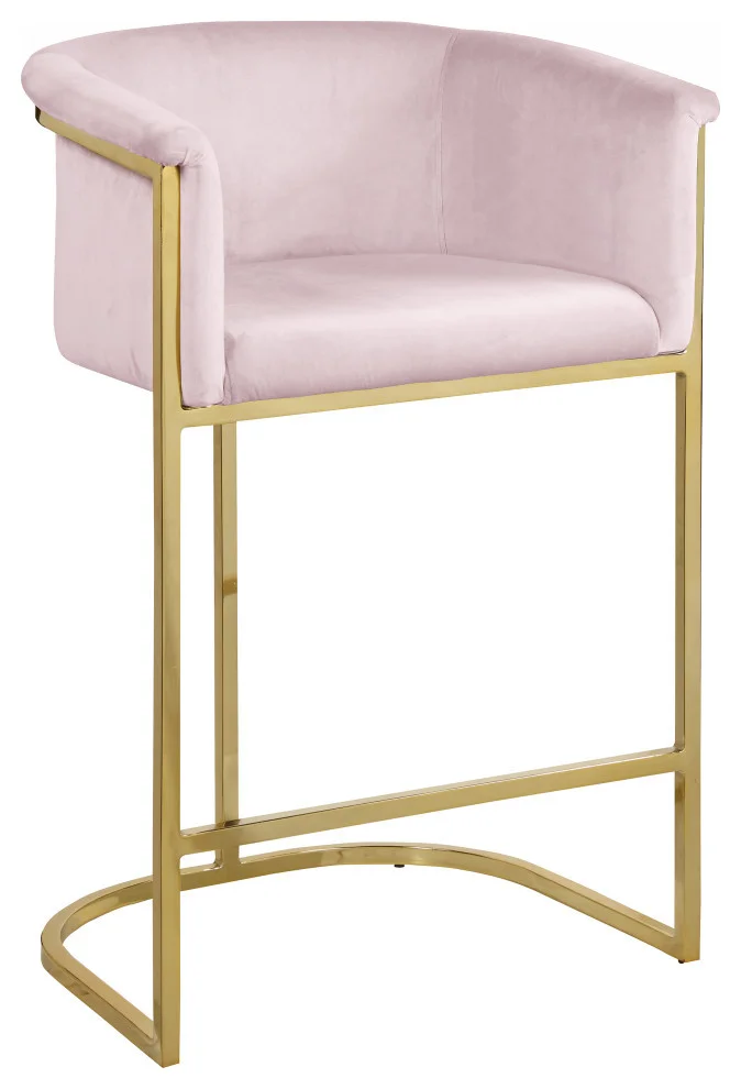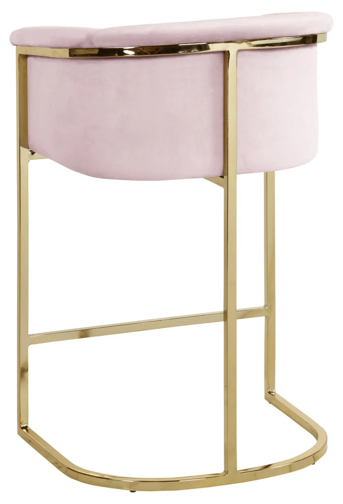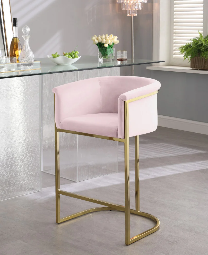 Complement your contemporary home furnishing with this Donatella Pink Velvet Stool from Meridian Furniture. Its curved design and rich beige velvet upholstery provides a comfortable, soft, luxurious seat for you to relax in, while also adding a touch of elegance to your living space. Its gold steel base adds the perfect balance to the stool’s soft pink color, in addition to holding the stool up to counter height and providing durable support for years to come.